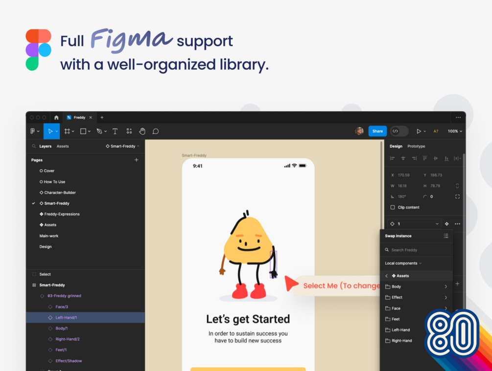 He comes with 26 pre-made expressions and poses, and you can even create your own characters and poses in Figma with these fully scalable and editable 100% vector character illustrations.