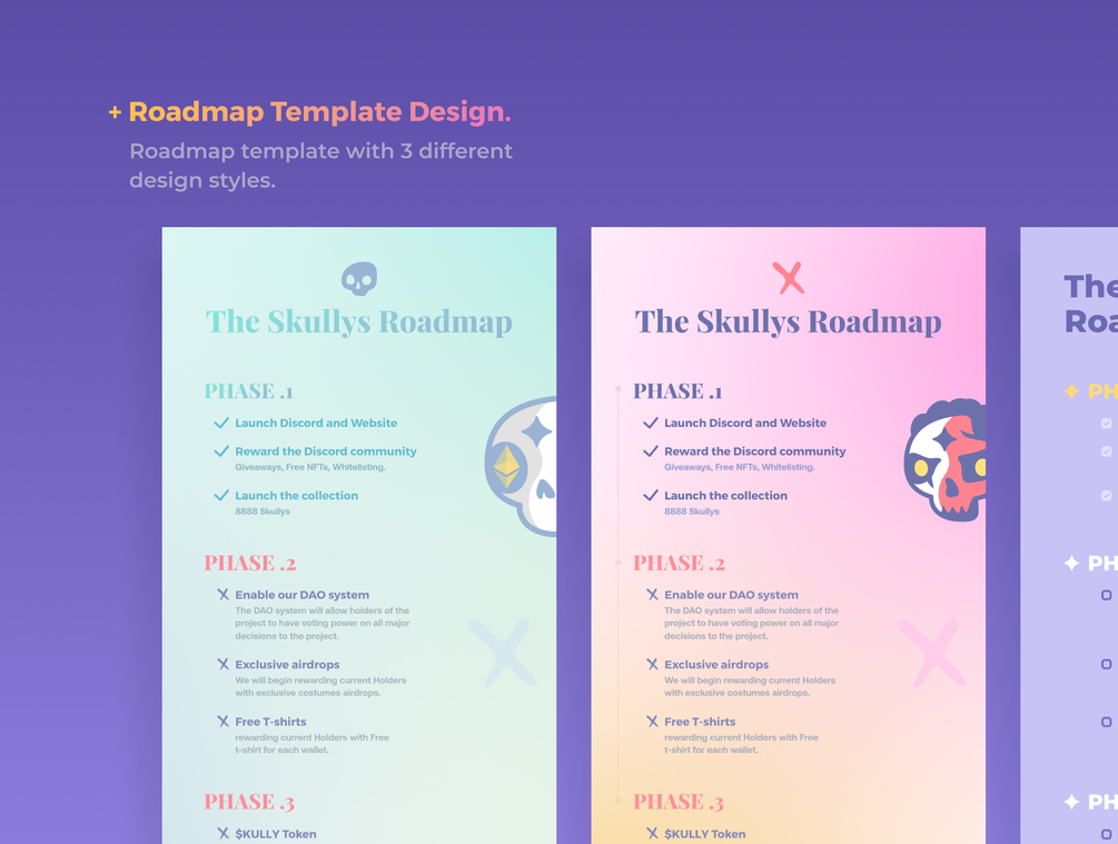 This NFT kit for Figma has it all, combining the simplicity of creating or editing your NFT collection, with a variety of Designs related to your NFT Collection (12 Social media post designs, Roadmap template designs, Opensea thumb/banner designs)