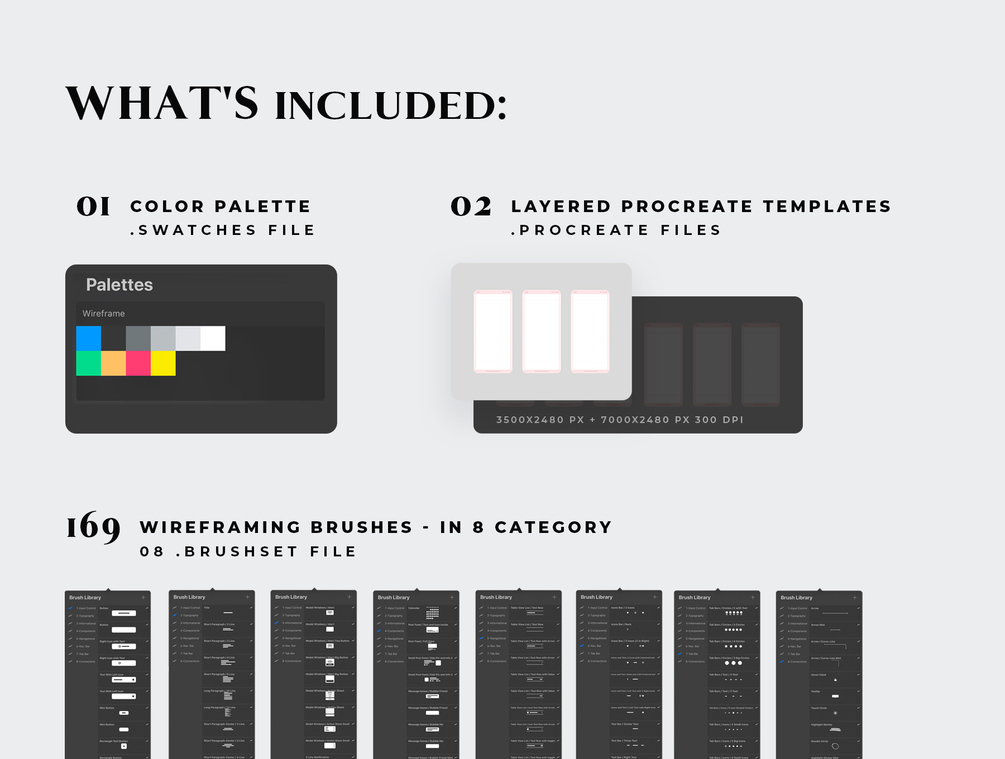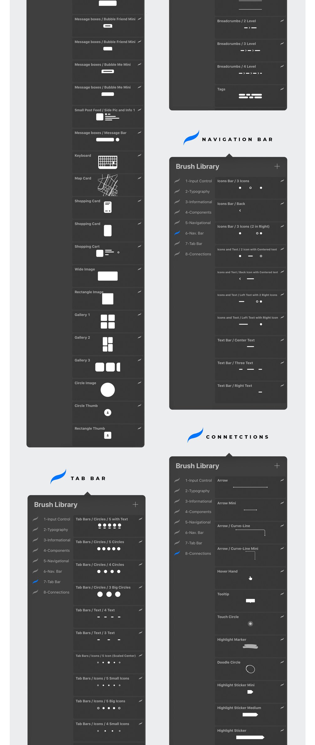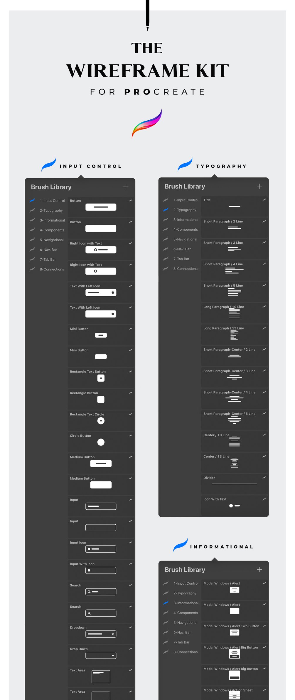 - 169 wireframing brushes in 8 category (08 .brushset file).